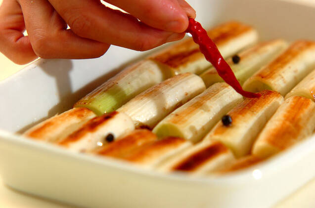 焼き色がついて、柔らかくなってきたら、残っている油ごと容器に入れ、レモン汁、粒黒コショウ、赤唐辛子を加える。