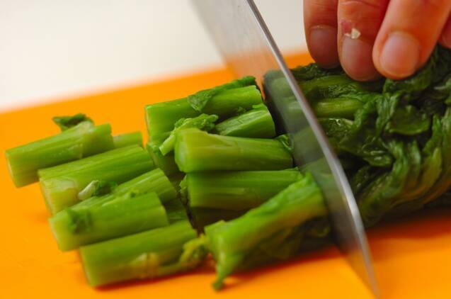 菜の花は軸のかたい部分を切り落とし、分量外の塩少々を入れた熱湯で1分程ゆでる。水に取り、粗熱が取れたら水気をしっかり絞る。ベーコンと菜の花は、長さ2cmに切る。