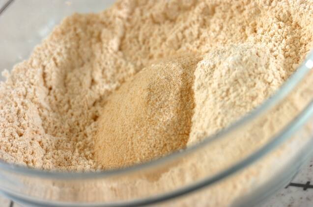 ボウルに強力粉、薄力粉、きな粉、塩を入れ、ゴムベラで混ぜ、きび砂糖を入れる。イーストを溶かした水を砂糖めがけて注ぎ入れ、ゴムベラで混ぜる。