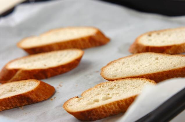 フランスパンをトースターか、200℃のオーブンで5分、両面さっくりと焼く。