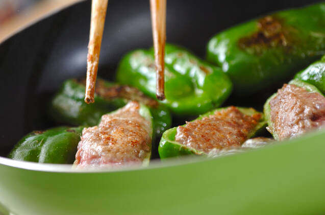 フライパンにサラダ油を中火で熱し、ピーマンを並べ入れる。全体に焼き色がつくまで返しながら焼く。