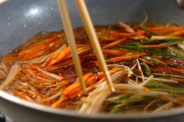 続けて野菜と<調味料>の材料を全て入れ、野菜に火が通るまで中火で炒め煮にする。