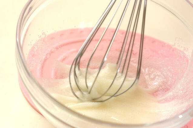 ボウルに卵白とグラニュー糖を入れ、泡立て器を大きく動かしながら、卵白がトロリとするまで混ぜ合わせる。
