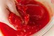 水煮ホールトマトは手でつぶして小鍋に入れる。ニンニクは縦半分に切って芽をとり、みじん切りにする。ルッコラは根元を切り落とし、水洗いして3cmの長さに切る。