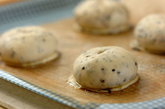 薄く伸ばした生地を下にして天板に置き、温かいところで、生地がひとまわり大きく膨らむまで二次発酵させる(30~40分)。この間にオーブンを230℃に予熱しておく。
