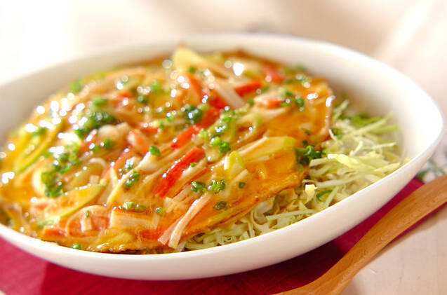 たっぷり甘酢あんをかけて下さいね!柔らかい春キャベツも一緒にどうぞ!