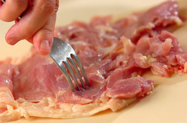 鶏もも肉は身の厚い部分をフォークで刺し、4等分に切って塩コショウをする。