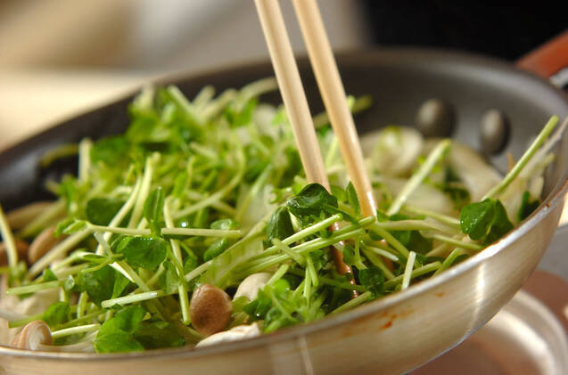 別のフライパンに残りのサラダ油を強火で熱し、玉ネギが透き通るくらいまで炒める。さらに豆苗、シメジを加えて炒め合わせ、塩コショウで味を調え、器に盛る。