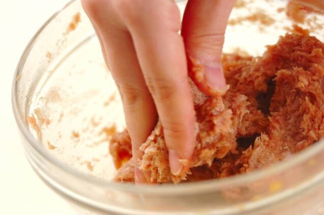 ボウルに豚ひき肉と<調味料>の材料を入れ、全体がポッテリするまでしっかりとこねる。
