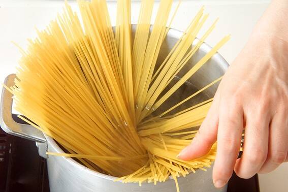 たっぷりの熱湯を沸かし、パスタの10%重量の塩を加える。パスタを袋記載の指示より少し短かめにゆで始める。