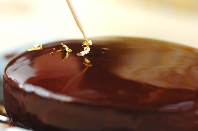 冷蔵庫で表面がかたまるまで冷やし、金粉、その他好みのオーナメントを飾る。