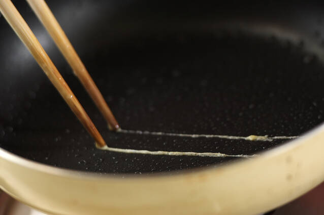 フライパンに薄くサラダ油をしき、中火にかける。菜ばしに卵液をつけて、フライパンの中央に線を引き、すぐに卵液が固まるくらいフライパンが温まったら、卵液を一気に流し入れ、全体に薄く広げる。
