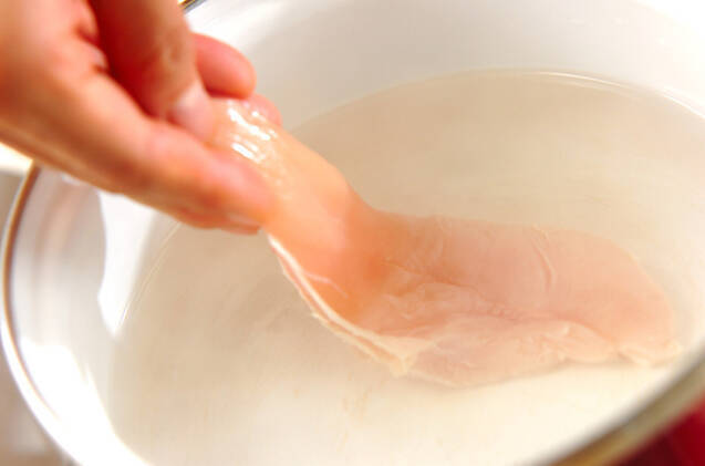 鶏ささ身は筋を引き、酒を入れた熱湯に入れ、ひと煮たちしたらそのまま冷ます。(ヒント)調理時間に鶏ささ身を冷ます時間は含みません。
