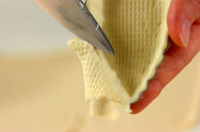 冷凍パイシートを厚さ2mmにのばし、タルトレット型に敷き込み、余分な生地はナイフなどでそぎ落とし、底面にフォークで空気穴をあけておく。