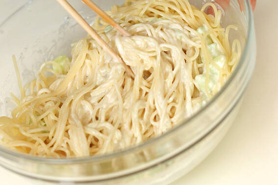 スパゲティを加えて混ぜ合わせ、器に盛り付け、生ハム、飾り用のアンデスメロンを盛り合わせる。実はバナナでも美味!意外でしょ。