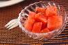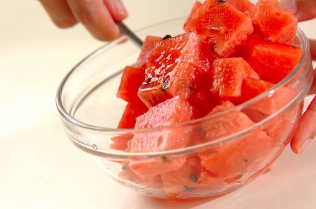 スイカは食べやすい大きさに切ってホワイトキュラソーをからめる。食べる直前まで冷やし、器に盛る。