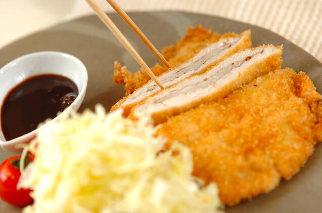 器にキャベツとプチトマト、食べやすい大きさに切ったカツを盛り合わせる。ウスターソースなどお好みのソースをかけて下さい。