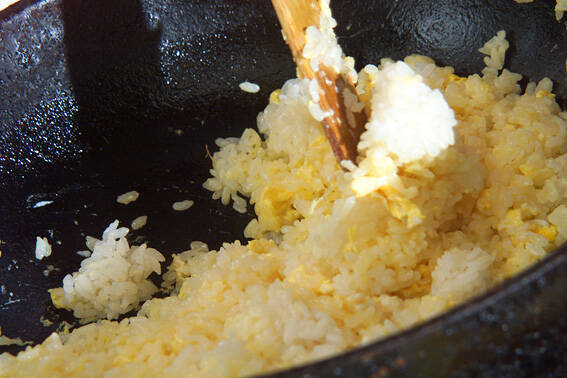 中華鍋にゴマ油大さじ1を強火で熱し、卵を流し入れてご飯を加え、パラパラになるまで炒めあわせ、いったん取り出す。