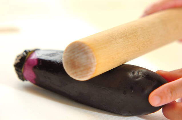 ナスはガクに1周切り込みを入れてきれいにむき、すりこ木などで軽く全体を叩いておく。