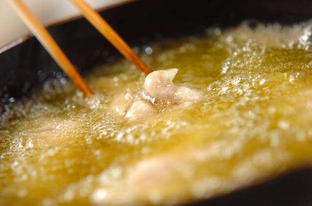 鶏手羽元を鍋から取り出し、キッチンペーパーで水気を拭き、<衣>をからめる。170℃の揚げ油で色よく揚げ、器に盛り、レタスとプチトマトを添える。