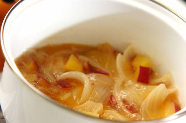 熱した鍋にバターをひき、玉ネギを炒める。しんなりしてきたら水、サツマイモ、顆粒スープの素を入れ、蓋をしてサツマイモが柔らかくなるまで煮て粗熱を取る。