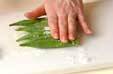 オクラはまな板に並べて塩を振りかけ、手のひらで転がしながら繊毛を取るようにこする(板ずり)。熱湯に塩ごと加えてゆで、水に取り、粗熱が取れればヘタを切り落とし、薄い輪切りにする。
