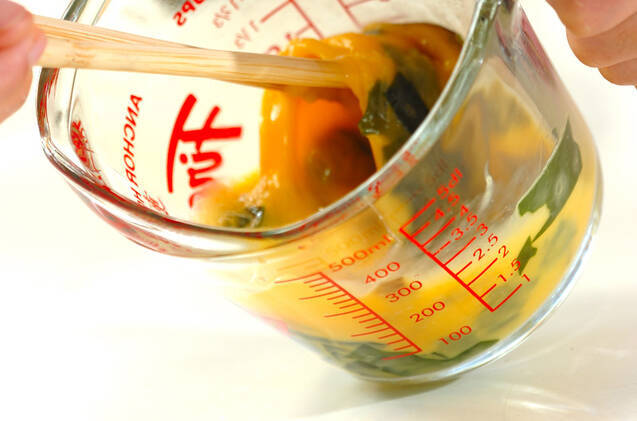 <だし巻き卵>を作る。卵を溶きほぐし、ワカメ、シイタケ、酒、だし汁を加えてよく混ぜ合わせる。卵焼き器を中火で熱してサラダ油を薄くひき、<だし巻き卵>の1/3量を流し込んで全体に広げる。