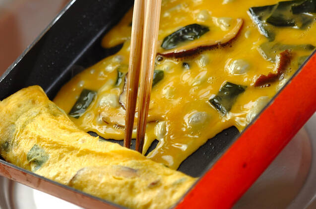 サラダ油を全体に薄くひき、残りの<だし巻き卵>の半量を流し入れ、巻いた卵を菜ばしで持ち上げてその下にも<だし巻き卵>を流し込む。