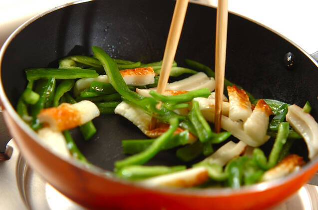 <調味料>の材料を混ぜ合わせておく。フライパンにゴマ油を熱し、ちくわとピーマンを入れ、中火で炒める。