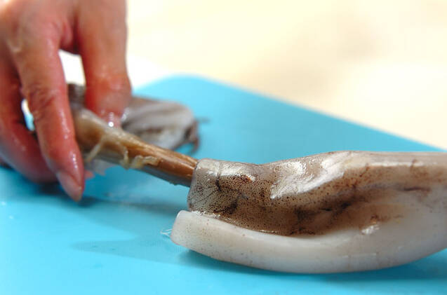 イカは胴と足がくっついている所を引っ張ってはずし、足を持って胴から引き抜く。胴は水洗いして軟骨を抜き取り、幅1cmの輪切りにする。足は目の際で切り落とし、くちばしを取って食べやすい大きさに切る。