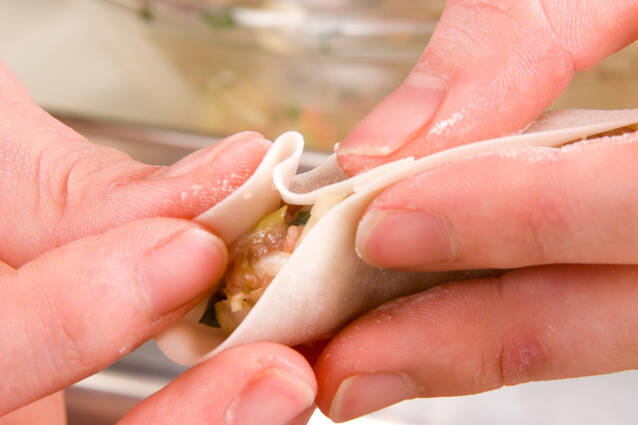 餃子の皮をに、(1)を大さじ1位のせ、皮のフチに水で溶いた片栗粉をグルッと薄く塗り、しわをよせながら包む。
