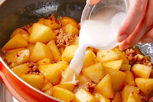 <水溶き片栗>を回し入れ、トロミがつけば、ゴマ油を加え香りを加え、ひと混ぜする。