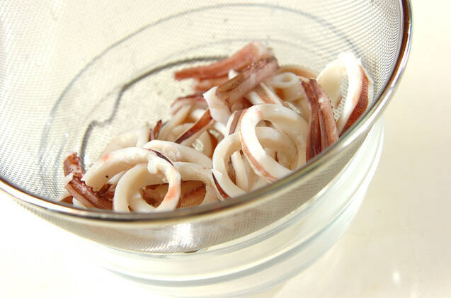 熱湯でイカをサッとゆでてザルに上げ、水気をしっかりきる。<合わせ調味料>のボウルに加え、サッと和えて器に盛る。