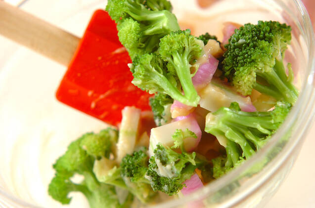 <からし酢みそ>のボウルにカマボコ、水気をきったブロッコリーを加えて和え、器に盛る。