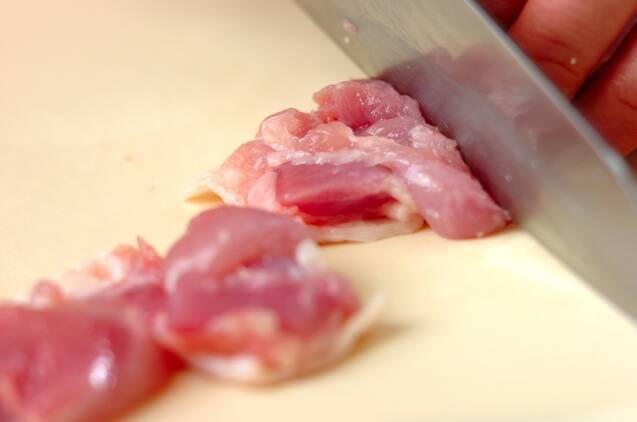 鶏もも肉は太い筋と余分な脂を取り除き、小さなひとくち大に切り、塩をもみこむ。ベーコンは幅5mmに切る。