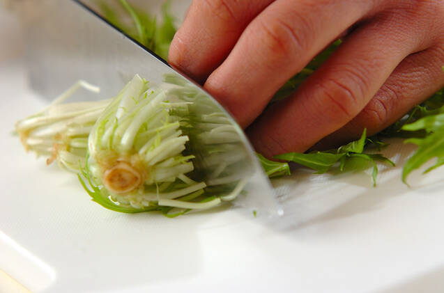 水菜は根元を切り落とし、長さ3cmに切る。