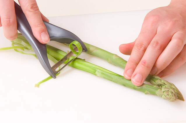 グリーンアスパラは根元を少し切り落とし、袴を取り、皮が堅い場合は皮ごとピーラー等でむく。塩を入れた熱湯でゆで、水に取り粗熱が取れれば水気を切って3cmに切る。