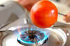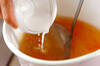 (1)の<スープ>を鍋に戻し、顆粒チキンスープの素を加えて火にかけ、煮たったらトマトを入れる。蓋をして弱火で10分煮る。トマトを取り出し、<水溶き片栗>をまわし入れてトロミをつけ、塩コショウで味を調える。