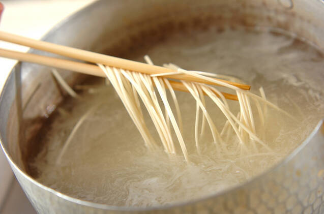 素麺は袋の指示通りに熱湯でゆでて水洗いし、水気をきって器に盛り分ける。