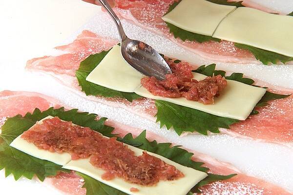 豚薄切り肉は2枚を少し重ねて広げ、薄く小麦粉を振り掛け、大葉、スライスチーズをのせ、<おかか梅>を塗り、端からクルクルと巻く。4本作る。
