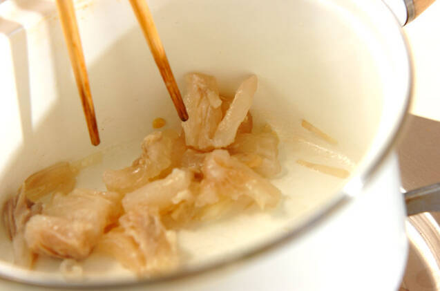 鍋にサラダ油、ショウガを中火で熱し、香りがたってきたら牛すじ肉を炒める。