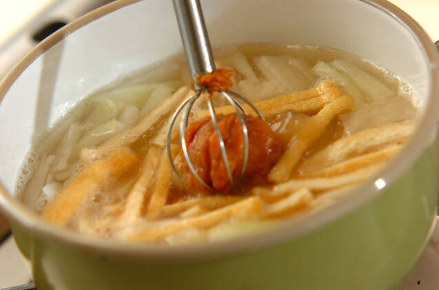油揚げを加え、再び煮たったらみそを溶き入れ、刻みネギを加えてひと混ぜし、器によそう。