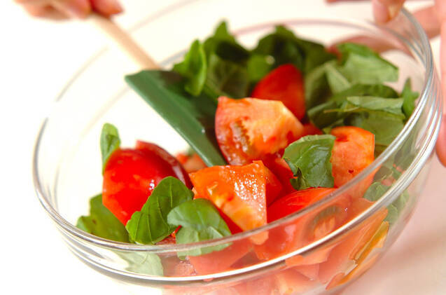 バジルはサッと水洗いし、小さくちぎってトマトと合わせておく。