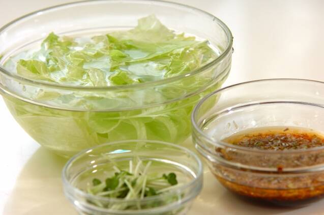 <ネギソース>の白ネギとショウガは細かいみじん切りにし、その他の材料と混ぜ合わせる。レタスは食べやすい大きさにちぎる。貝われ菜は根元を切り落とし、長さを3等分に切る。