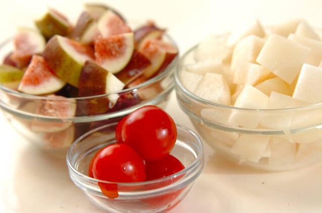 野菜や果物を洗う。皮ごと食べられる果物は皮付きのままよく洗い、2cm位の大きさに切る。※今回はイチジク、梨、プチトマトを使用しました。