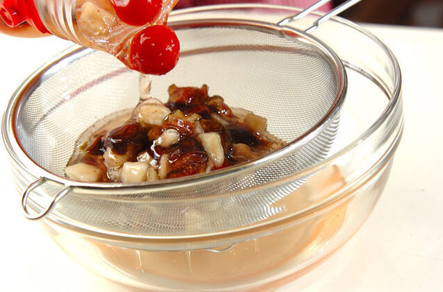1~2週間経って、漬け込んでいる素材が縮んできたら、ザルやネットで材料をこしてエキスを抽出し、保存用の瓶に移す。約1Lのエキスが採れる。水や炭酸などで10倍に薄めて飲む。