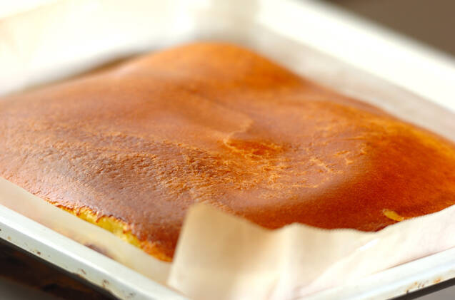 オーブンの天板、または25cm角くらいのバットにオーブンシートを敷き、1を流し入れて170 ℃に予熱しておいたオーブンの下段で20~25分、表面に焼き色がつくまで焼く。竹串を刺してみて何もついてこなかったら焼けています。焼き色が薄い場合は、温度を220 ℃に上げて天板を上段に入れ、焼き色をつけて下さい。
