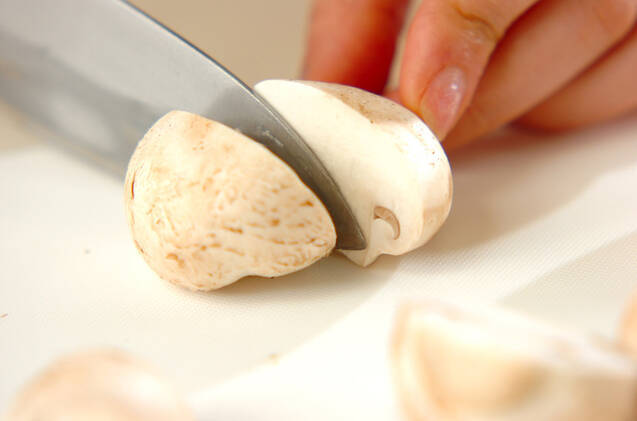 マッシュルームは石づきを切り落とし、汚れを拭き取って縦半分に切る。