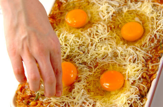 3のカレーに炊きたてご飯を混ぜ合わせて、耐熱容器に入れ、ピザ用チーズを全体に掛ける。卵を割り入れてオーブンに入れる。