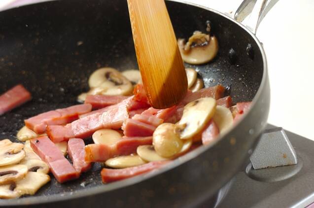 フライパンにオリーブ油を中火で熱し、ベーコン、マッシュルームを炒める。